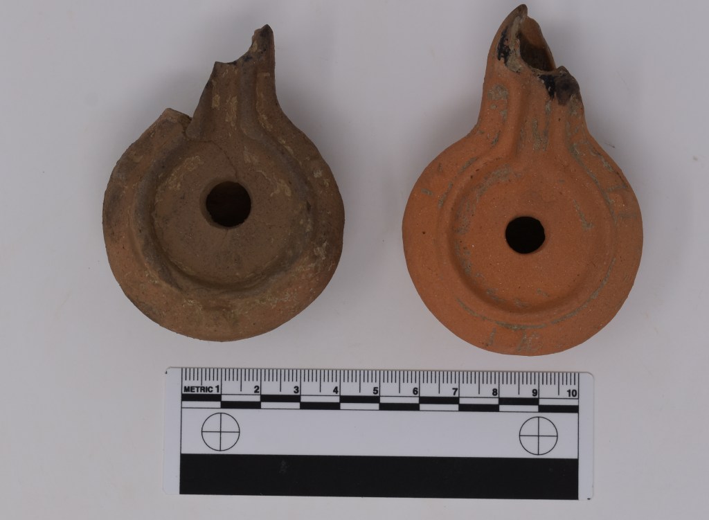 This type of lamp was common in Umbria, indicating the possible presence of a production center nearby,11 or a regionally specific style. This style of lamp could have been made on-site, which would have required a kiln. Pottery was first modeled from clay, either by hand or using a mold, then baked hard. Although we have not found a kiln itself, we have found several wasters12 indicative of a kiln onsite. We also know that the villa occupants had access to the fuel necessary for firing because they had a heated bath complex, which would have required a constantly running furnace.