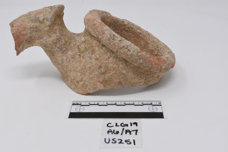 In the Roman period, large amphora were used to transport agricultural products across the Mediterranean, in particular wine, oil, and grain. While the general shape of the amphora is standard across the Mediterranean—a narrow rim and neck, a wide body, a pointed toe, and two handles for carrying—the specific style of the handles, the rim, and the toe, as well as stamps on the handles or neck, indicate its place of origin. The amphora fragments from the Gioiella-Vaiano Villa are still being studied, but a few pieces stand out. For example, in 2019, just above the floor of the nymphaeum, we found the preserved rim and partial handle of a Rhodian wine amphora; evidence that the owners connections with the luxury world of the high Imperial period.