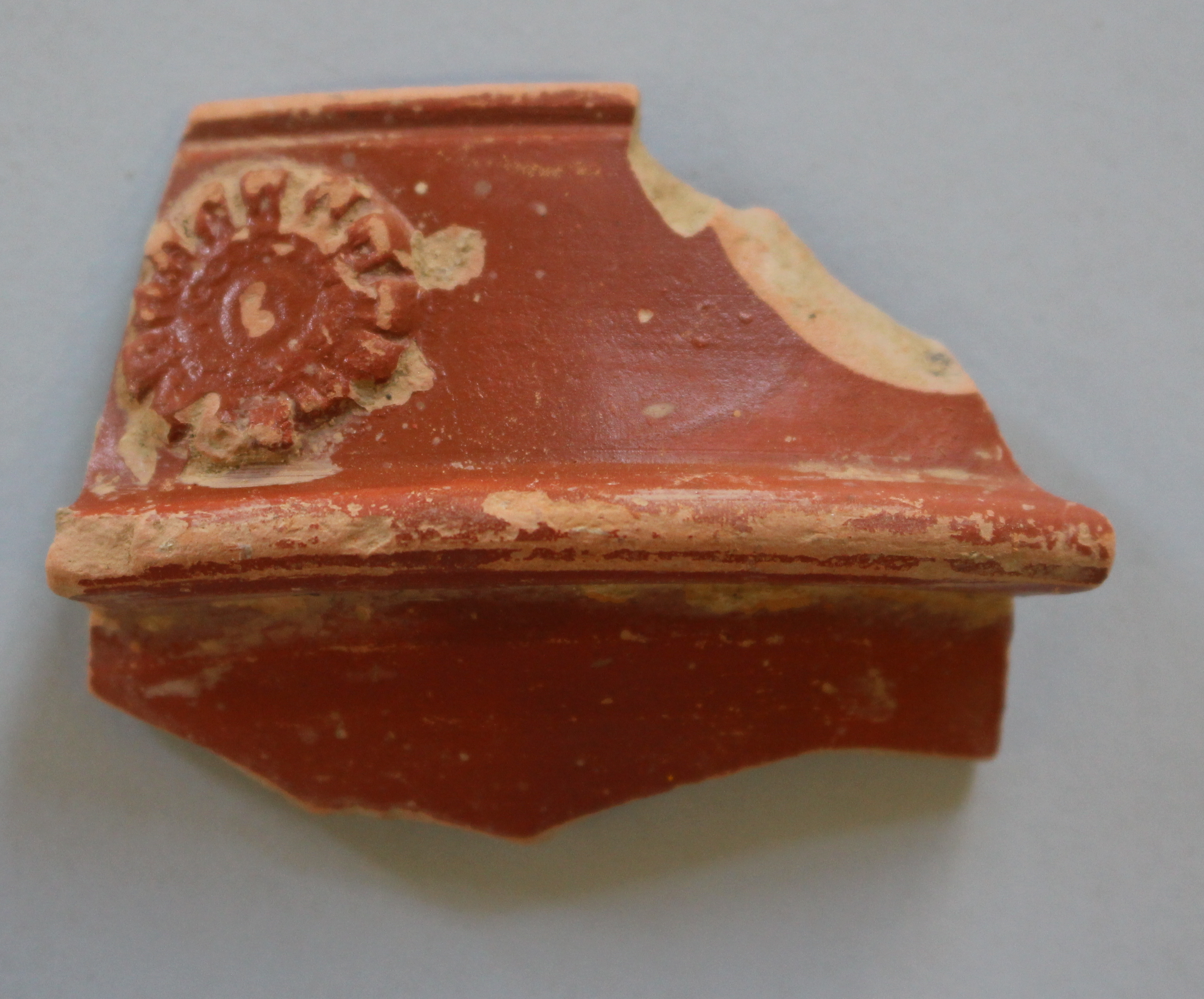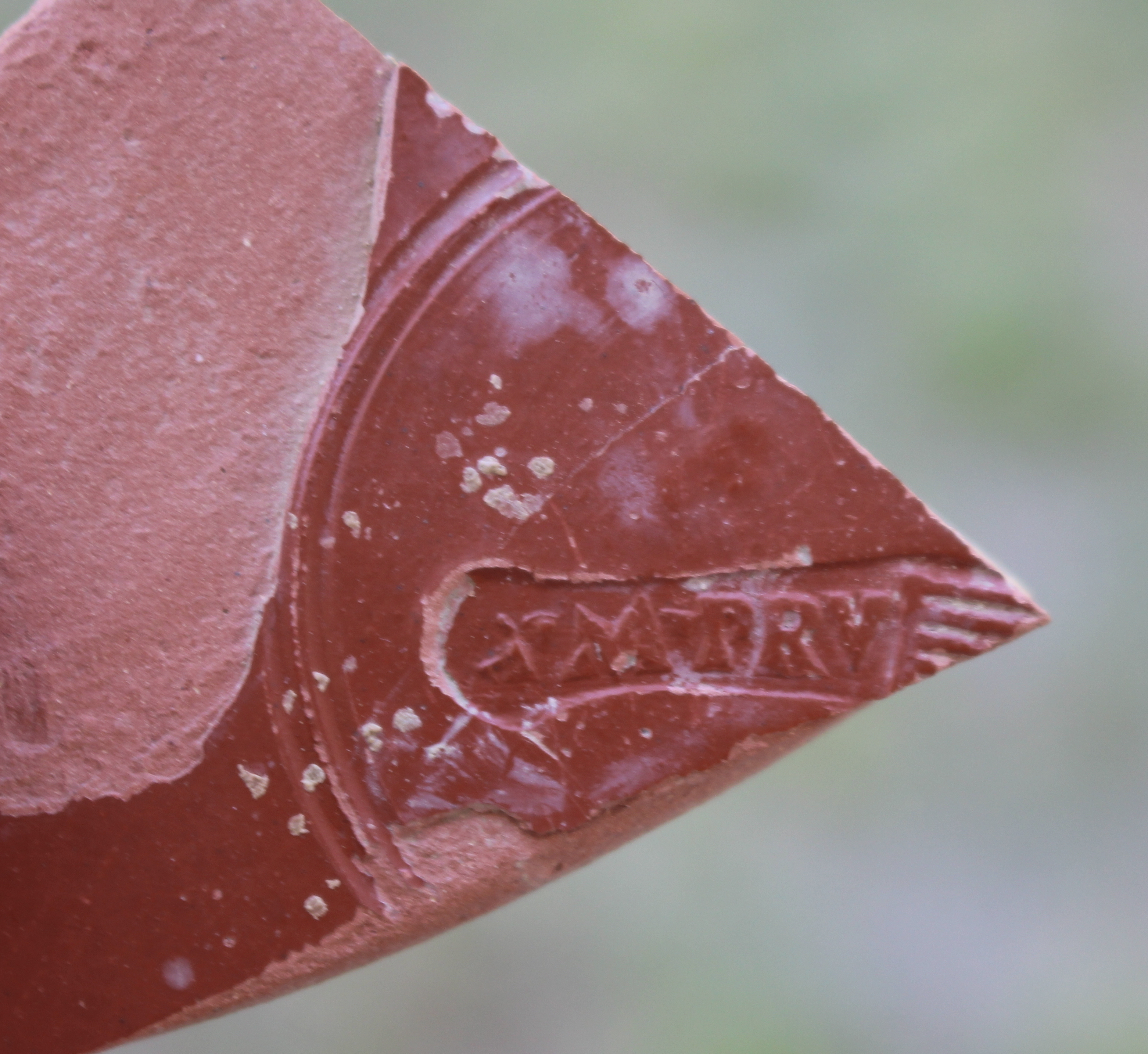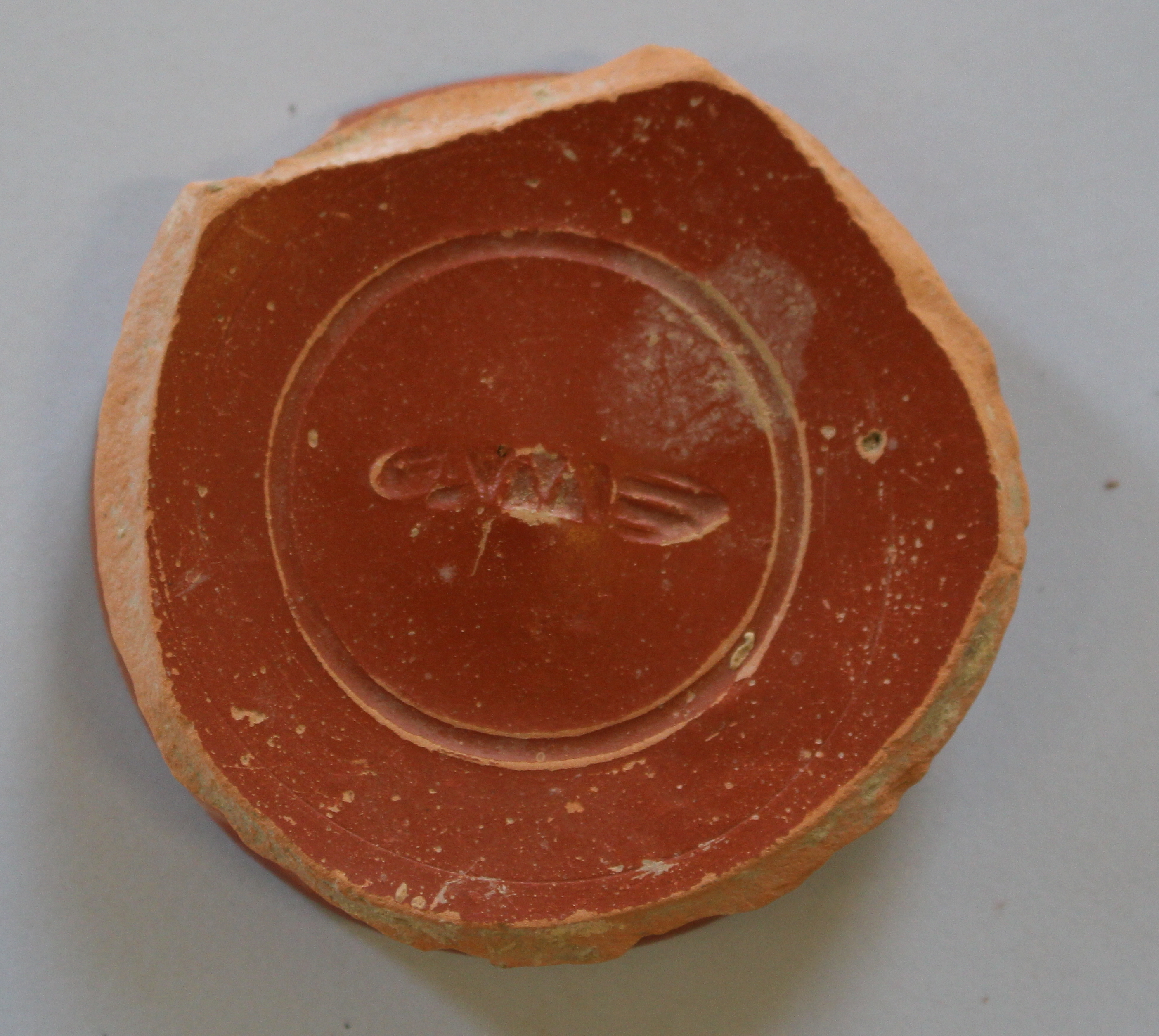 From 400 BC to the end of the Roman Republic, vernice nera or black-gloss ware was the preferred table ware in Italy. The presence of vernice nera at the Gioiella-Vaiano Villa is an indication that the site was originally occupied in the 2nd century BC. Around 40 BC, a glossy red-slipped ware is introduced at Arretium. This is commonly referred to as Sigillata Italica and eventually various workshops emerge in Italy and the provinces. In addition to applied and relief decoration, sigillata italica, is often stamped with the name of the workshop. We have several examples of such stamps from workshops in Arretium. Sometimes the stamps are in the shape of a foot, called an in planta perdis.