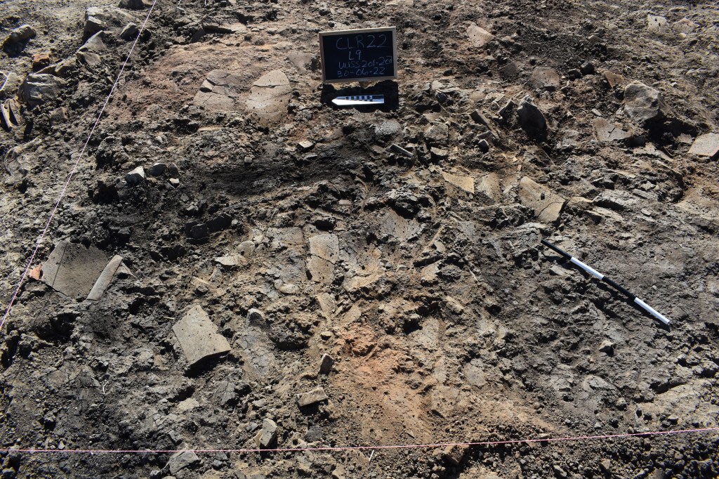 The kiln was formed by digging a pit into the natural clay and lined with wood beams, the carbonized remnants of which are still visible around the edges. The pit was then filled with stone and capped with a clay “roof.” The wood was then set on fire and the whole thing would have been allowed to burn until most of the stone had become lime. Many small, irregular pieces of limestone were recovered from the bottom of the pit. The kiln would have only been used once.
