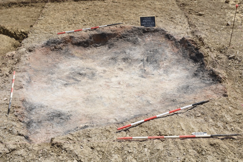 The second excavation area, Delta, was opened to the southeast where the magnetometry survey showed a possible kiln adjacent to another anomaly that looked like a possible workshop. During excavation evidence of intense burning was uncovered in an area that, based on the pottery and tile recovered as well as a collection of late Roman bronze coins, suggested a domestic space, possibly a kitchen (Figs 4 and 5).