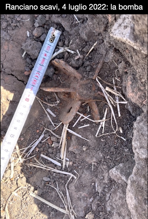 On 4 July 2022, a member of our team felt and heard the clang of metal-on-metal when their pickaxe struck the tail fin belonging to a British 4.2″, 20-lb. mortar embedded in the ground on the east edge of trench L10 in the Delta sector of the Ranciano dig site (see photo, right). We cleared the area, and our excavation was abandoned. But how and when did the mortar get there? We began to investigate what happened during the Second World War, and learned about the Battle of Ranciano, which took place on 24 June, 1944.