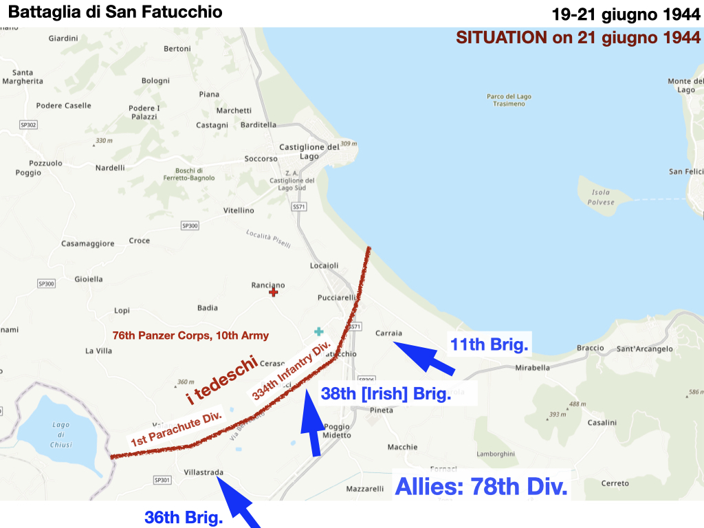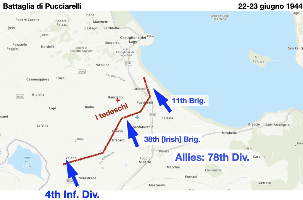 From 17-29 June, fierce fighting occurred on both sides of the lake involving some 60,000 men. To the west, difficult battles at San Fatucchio (19-21 June) and Pucciarelli (22-23 June) involved in particular the 38th (Irish) Brigade of the 78th Infantry Division (see maps below).