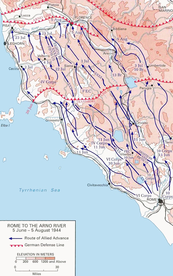 (map, left: Wikimedia [Laurie, Clayton D. Rome-Arno 1944, CMH Online bookshelves: WWII Campaigns, Washington: US Army Center of Military History CMH Pub 72-20, Page 24])