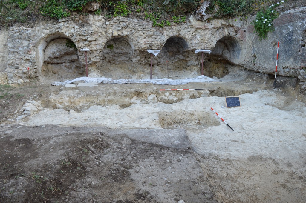 Excavations on the south side of Castiglione del Lago, below Via Belvedere, began in 2023. The presence of Roman structures below the Medieval walls of the town has long been known due to the visible remains of an arched structure with four niches oriented east-west and an adjacent water channel that runs from north to south. These structures are familiarly called “Le Buccace” by local residents. The opus mixtum technique visible on both structures dates their construction to ca. A.D. 100 (Fig. 1).