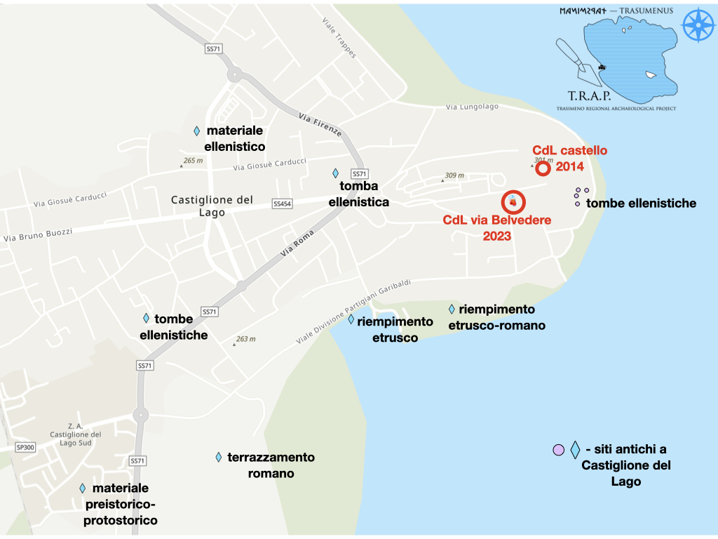 Archaeologists and historians have long postulated that there must have been an Etruscan and subsequent Roman settlement on top of Castiglione del Lago given its position overlooking the lake. To the east of “Le Buccace,” there is an Etruscan necropolis of the Hellenistic period, that was discovered in the early 2000’s during construction work (see tomb page). Scattered finds around Castiglione del Lago indicate other Etruscan burials but no evidence of a settlement. Excavations conducted inside the Rocca (2014) found no evidence of occupation on top of Castiglione del Lago prior to the Medieval period. It is also notable that none of the Medieval or Renaissance structures in the center of Castiglione del Lago show evidence of having reused Roman building materials and no Latin inscriptions have been found in or around the town itself (Fig. 2).