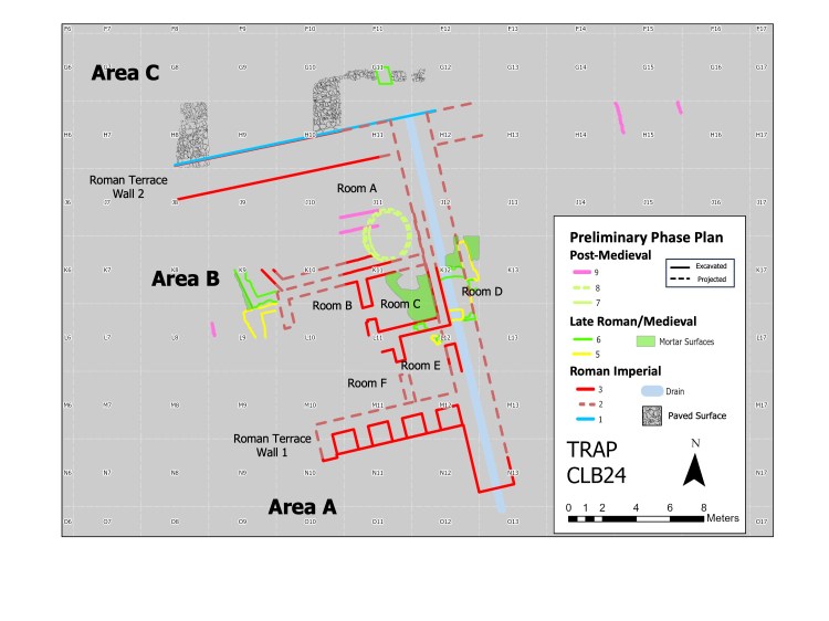 Between the 2023 and 2024 campaigns, the TRAP team investigated three levels of the site: the area between the arched wall and the drainage channel (Area A), the terrace just above the arched wall (Area B), and the third terrace up from the arched wall (Area C).